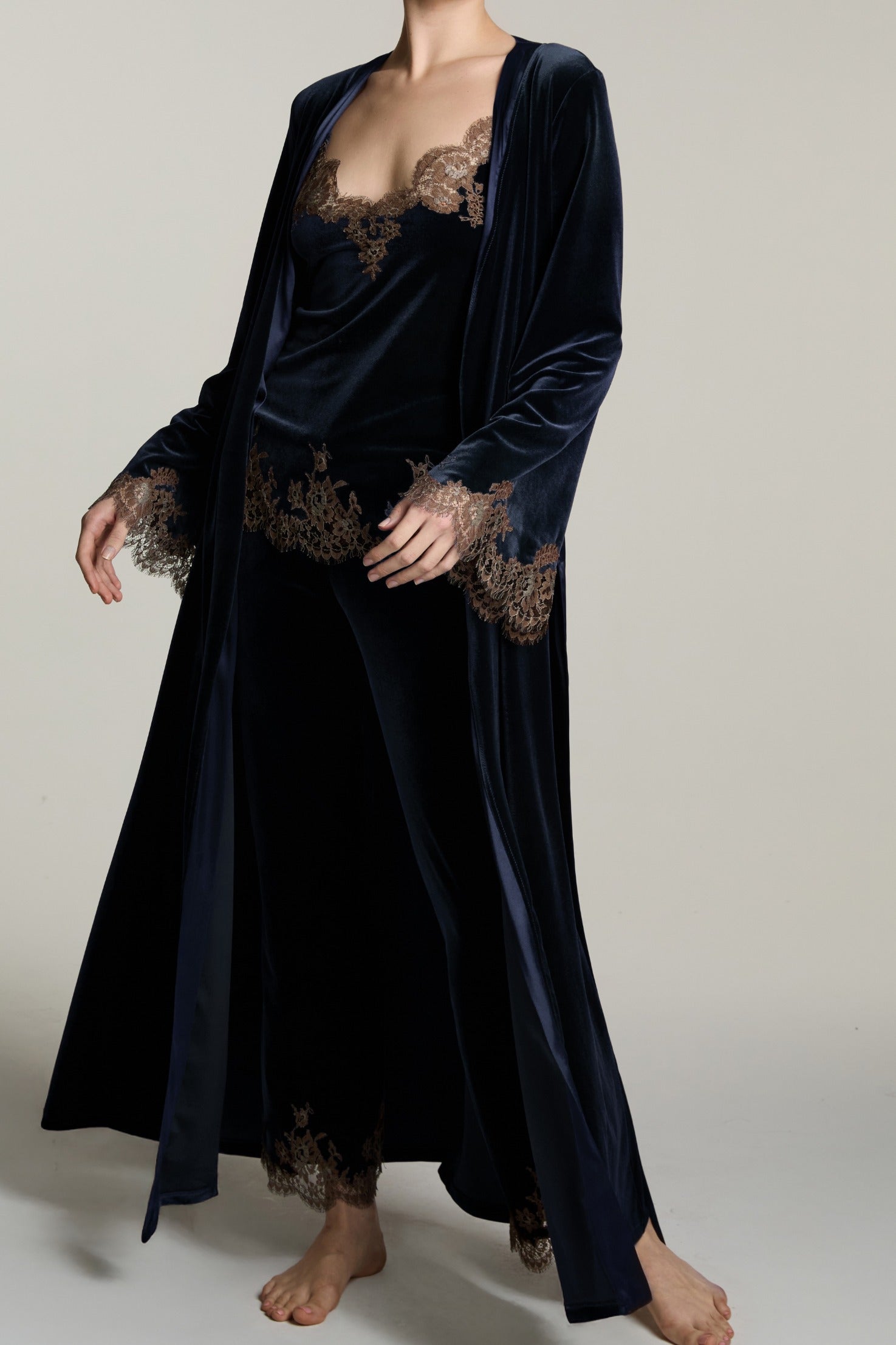• Velvet long robe with lace inserts